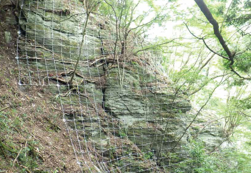 フリーネット(FN工法)は、転石・落石の危険性がある浮石に対して強度の高いワイヤロープや金網を密着させ抑え込み発生源で抑止する落石予防工。落石防止だけでなく、法面の自然保護や緑化促進も期待できる。