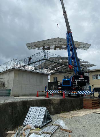 「簡易屋根トラス」は専用トラス部材と筋交い・布板を主要部材とし、外部足場に直接取付を可能にした全天候型仮設屋根で、「全ての建設現場に屋根を」というコンセプトの下開発された。トラス本体以外は従来...