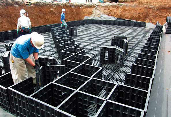 FRPと埋設型枠のKKフォームを使用した、ハイブリッドな新型橋梁排水桝。コンクリート床版と排水桝の付着強度が増すことより、コンクリート床版からの漏水を防ぎ、コンクリート表面の美観の向上等を実現する。