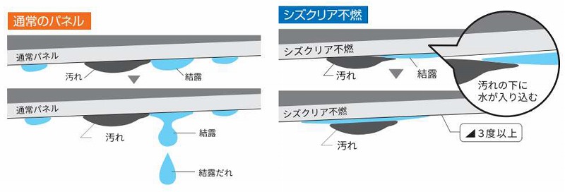 本製品は親水コーティングを付与したことで、パネルに付着した結露水は膜状に広がり、天井勾配に沿って流れるため、天井からの水滴落下を軽減することが可能。