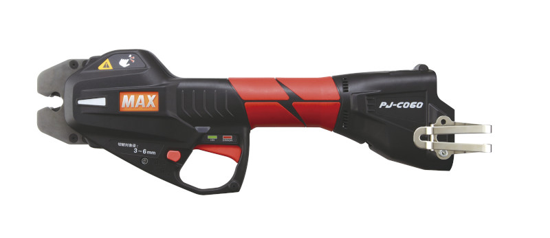 「PJ-C060」は、片手で楽に作業できるコンパクトな本体形状で、直径6㎜までのメッシュ筋を1カット0.7秒で切断、また、手動式での切断が大変な2本切りも可能である。