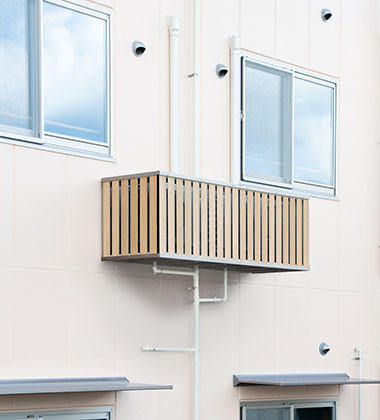 木目調の縦格子が無機質な印象を和らげ、住宅や施設の外観をすっきりと引き締める。