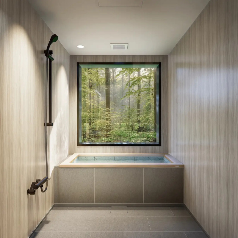檜と十和田石を組み合わせた浴槽を標準仕様とし、価格を抑えながらも贅沢な素材感を実現。 - 静けさと穏やかさの演出