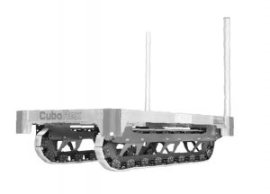 既存のキャスター台車に取り付けることで、不整地での運搬を可能にする平床台車用クローラ。