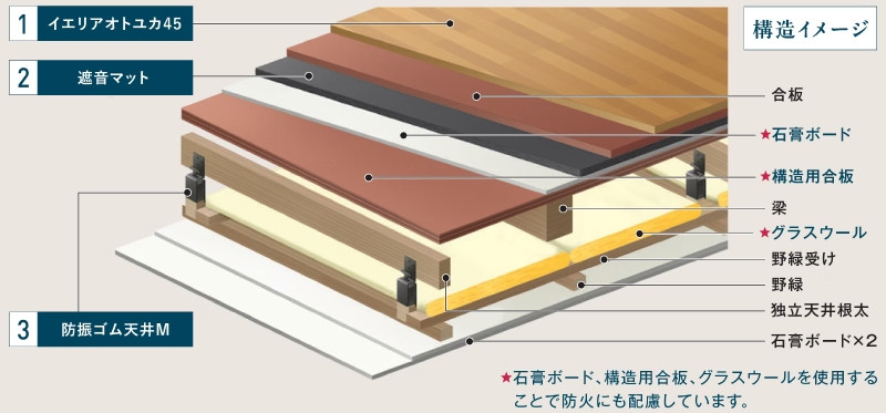 また、製品および床構造材を組み合わせた状態で提案するため、複雑な防音設計は不要で、施工も大工工事だけで完結する。