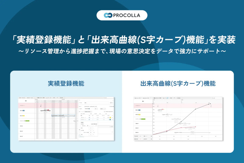 株式会社Arent(本社:東京都港区、代表取締役:鴨林広軌)は、AIクラウド工程管理システム「PROCOLLA(プロコラ)」に工事の進捗状況をリアルタイムで把握・分析できる「実績登録機能」および「出来高曲線(S字カーブ)機能」を正式にリリースした。