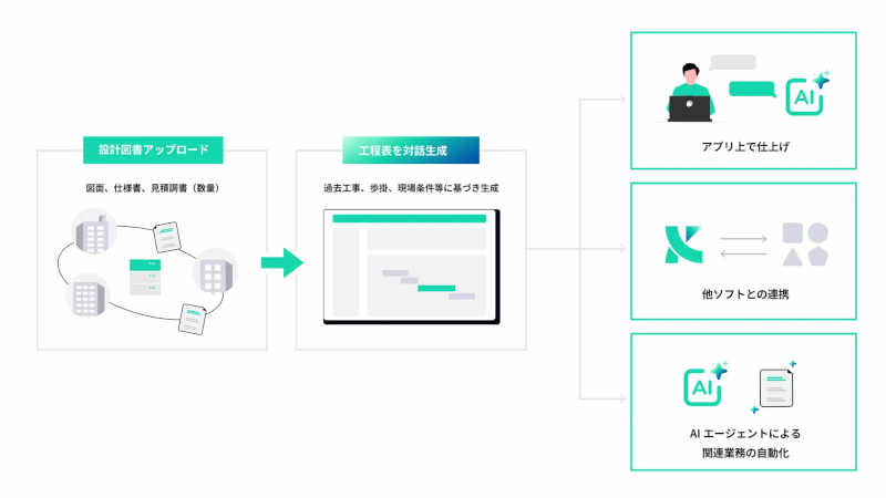 「Kencopa工程AIエージェント」は、工程表作成・実施工程運用にかかる時間の短縮のみならず、活用の中で自動蓄積される設計図書と工程・歩掛・工事データを合わせた会社独自ナレッジデータベースの蓄積により、省人化と技術継承を同時で実現する。