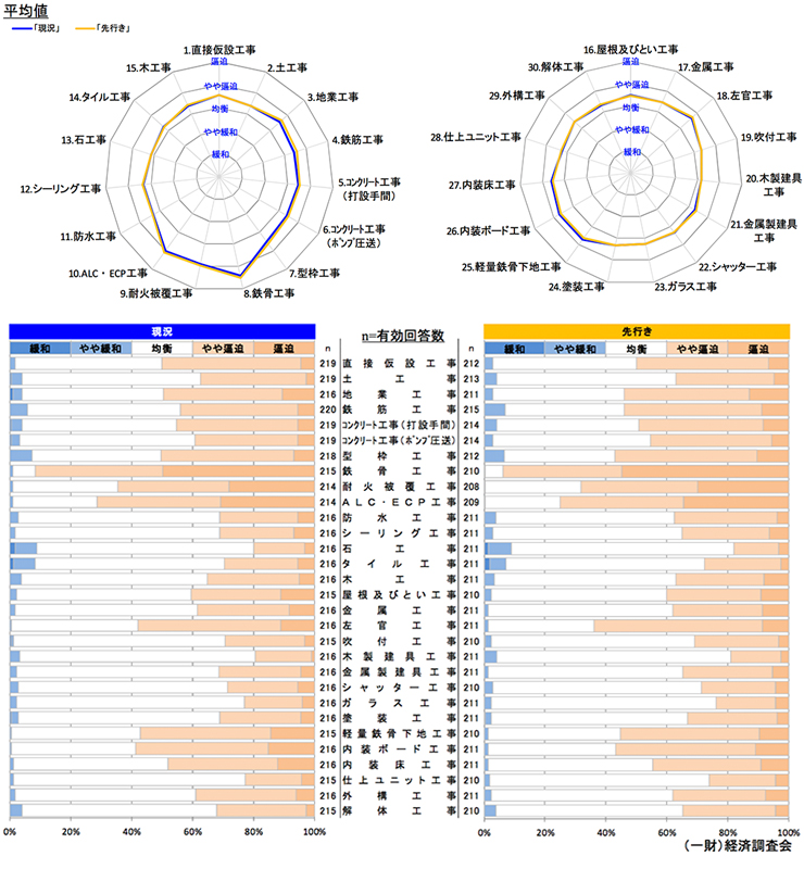工事受注状況および職種別労務需給状況について、対象都市(全国11都市)ごとの単純平均により代表値を算出した上でグラフ化する。