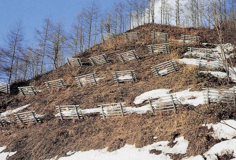 [主な特長]1)ワイヤーロープで吊る構造のため、土質条件が悪い場所や基礎堀りが困難な場合に有効、2)急勾配や起伏の激しい自然法面に有利、3)主に積雪深が3.0m以下の斜面の設置が望ましい-など。