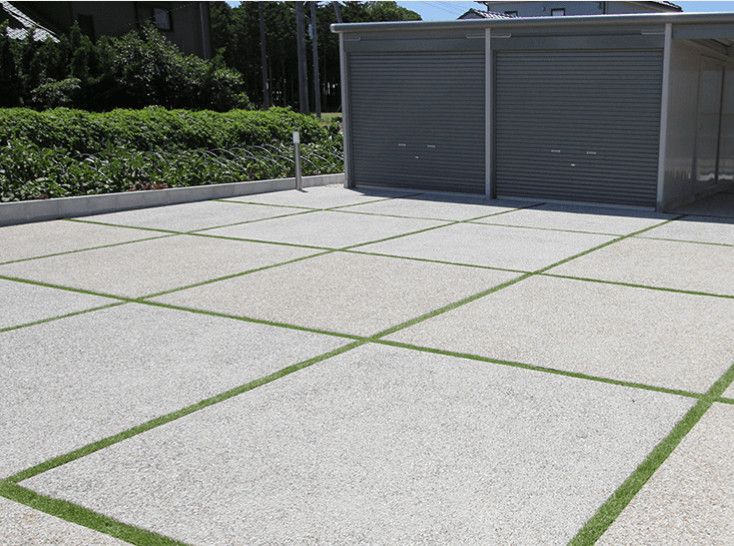 「メモリーターフ スリット」は、駐車場等のスリット(目地)に用いる。砂利やタマリュウ等の植物のようにメンテナンスの手間がなく、美しいアクセントを容易に実現する。