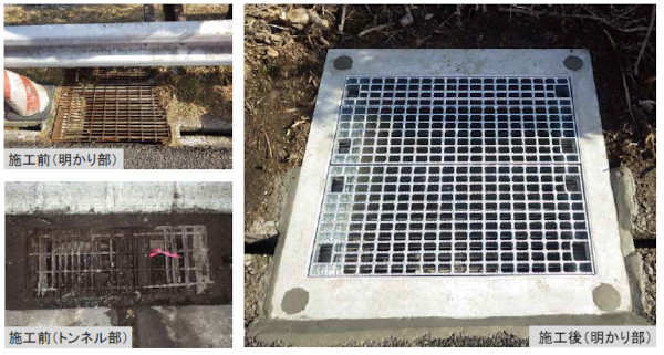 ハイパー桝カット工法は専用カッターの使用により、取り壊し作業、コンクリート打設等が不要であり、工期短縮が可能となる工法で、劣化が進行した既設集水桝の修繕に有効である。