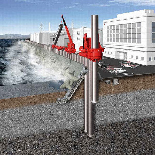 「ジャイロプレス工法」は、先端ビット(切削爪)付き鋼管杭を回転させながら圧入することで、転石・岩盤層などの硬質地盤や既設鉄筋コンクリート構造物などの地中障害物を切削貫通し、自立式の鋼管杭連続壁...