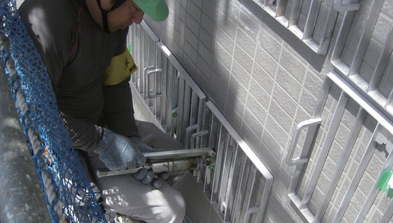 プレスダウングラウト工法は、金属フレームでタイル面を押さえることにより、仕上面のはらみや目地破壊なく、接着層の薄い直張タイルの浮き補修工法として可能となった、エポキシ樹脂注入工法。