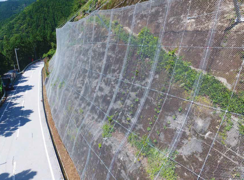 フリーネット(FN工法)は、転石・落石の危険性がある浮石に対して強度の高いワイヤロープや金網を密着させ抑え込み発生源で抑止する落石予防工。落石防止だけでなく、法面の自然保護や緑化促進も期待できる。